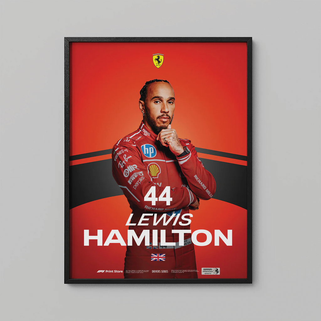 The Lewis Hamilton Ferrari 2025 Drivers Series Poster commemorates a landmark moment in Formula 1® history: the seven-time World Champion joining Scuderia Ferrari HP. Showcasing Hamilton in his iconic red race suit, the artwork captures both legacy and ambition. Printed to the highest standards, it celebrates one of modern motorsport’s most anticipated partnerships.